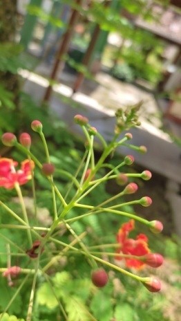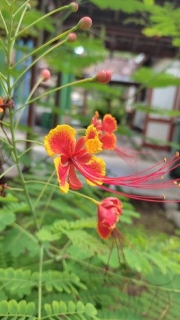 Tumbuhan ini memiliki bunga majemuk yang panjangnya 15-50 cm, warnaya merah atau kuning. Mahkota bunganya bisa mengalami metamorfosis menjadi tabung mahkota.bentuk bunga kupu kupu,bunga majemuk,kelipatan bagian bunga yaitu 2 lapis,kelopak bunga ada 4,terdapat benang sari dan berwarna merah dan ujungnya kucing,bakal buang tidak terlindungi permukaan kelopak bunga kasar dan teskturnya berkerut.ujung bunga melengkung.