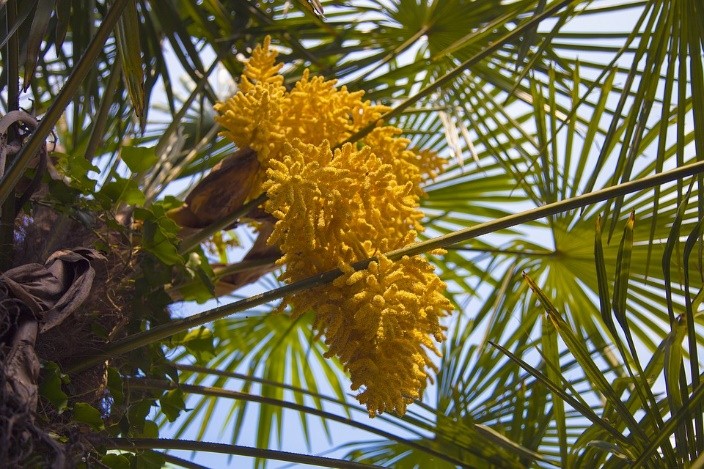 Pohon palem ini memiliki bunga yang tersusun dalam karangan yang dalam kondisi masih muda terlindung oleh seludung bunga. Karangan bunga palem ini disebut mayang. Tangkai mayang ini bila dilukai akan mengeluarkan cairan manis yang disebut nira. Dalam karangan bunga ini terdapat bunga dan bunga jantan. Dan penyerbukan biasa dilakukan oleh serangga atau burung kecil.