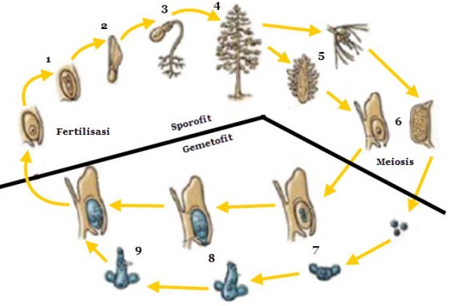 Organ reproduksi pada gymnospermae disebut konus atau strobilus. Tumbuhan berbiji terbuka tidak memiliki bunga, sporofil terpisah-pisah atau membentuk srobilus jantan dan betina. Makrosporofil dan makrosporangium yang tampak menempel pada strobilus betina. Letak makrosporofil dan mikrosporofil terpisah. Sel kelamin jantan berupa spermatozoid yang masih bergerak aktif. Di dalam strobilus jantan terdapat banyak anteridium yang mengandung sel-sel induk butir serbuk. Sel-sel tersebut bermeiosis dari setiap sel induk terbentuk 4 butir serbuk yang bersayap. Pada strobilus betina terdapat banyak arkegonium. Pada tiap-tiap arkegonium terdapat satu sel induk lembaga yang bermeiosis sehingga terbentuk 4 sel yang haploid. Tiga mati, dan satu sel hidup sebagai sel telur. Arkegonium ini bermuara pada satu ruang arkegonium.