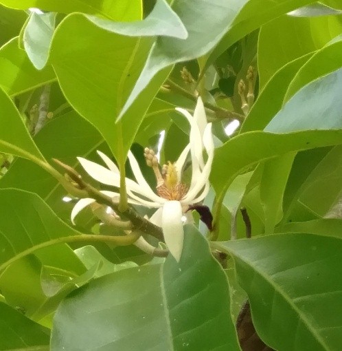 Bunga pada pohon Cempaka Putih berbentuk seperti menjari. Bunga Cempaka Putih termasuk bunga tunggal karena hanya terdapat satu bunga pada satu tangkai. Bunga Cempaka Putih berwarna putih. Bunga Cempaka Putih termasuk bunga sempurna karena memiliki mahkota, putik, dan benang sari. Mahkota bunga ini berwarna putih, benang sari berwarna coklat kekuningan, dan putik yang berwarna hijau. Bakal buah pohon Cempaka Putih tidak terlindung oleh daun buah.
