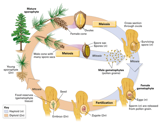 Pada Tumbuhan Pinus reproduksi seksualnya yaitu dengan pembuahan tunggal dan alat perkembangbiakan generatifnya adalah strobilus. Pada tumbuhan pinus terdapat dua jenis strobilus dalam satu pohon yaitu strobilus jantan dan strobilus betina. Kerucut sporofit jantan mengandung mikrosporangia yang kemudian membelah secara meiosis untuk menghasilkan gametofit jantan. Pada pembelahan meiosis tersebut mikrosoprangium diploid membelah menghasilkan 4 mikrospora haploid yang kemudian berkembang menjadi serbuk sari jantan. Kerucut sporofit betina mengandung megasporangia yang kemudian membelah secara meiosis untuk menghasilkan gametofit betina. Pada pembelahan meiosis tersebut terjadi di kerucut ovulasi dan menghasilkan 4 megaspora haploid.
